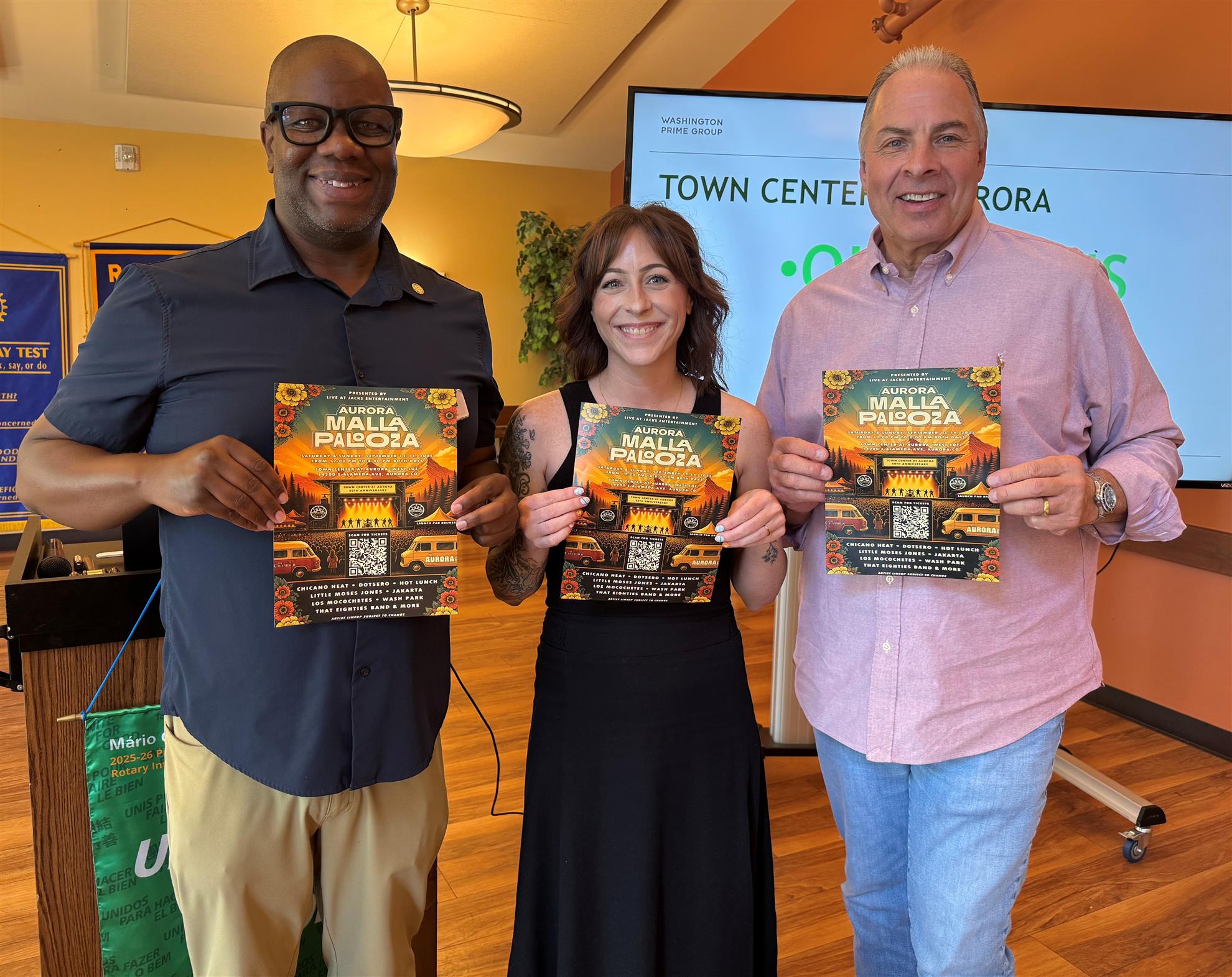 Joel Boyd General Manager of Town Center of Aurora on the left, Chelsea Thatcher Town Center of Aurora Marketing Director, and Scott Cartwright Operations Director came to talk about the 50th Aurora Town Center Anniversary! The 50th Anniversary Celebration will be on September 13th and 14th at Town Center West parking lot. Singing groups include Chicano Heat, Dotsero, Hot Lunch, Little Moses Jones, Jakarta, Los Mocohetes, Wash Park, That Eighties Band and more.